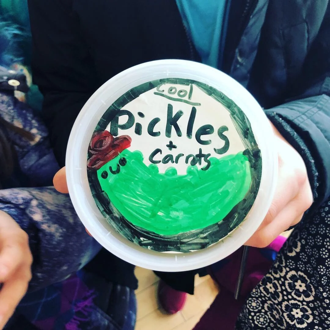 Have kids mix a solution of cider vinegar, water, sugar and salt together. They then select a variety of vegetables: cauliflower, green beans, carrots, cucumber, radish, fennel and different spices: star anise, cinnamon, peppercorn, all spice, and herbs: dill, parsley, thyme, . They place them in their clean jars, and pour the vinegar solution over them. So easy! While the mixture cools, have the kids create a label for their pickles or pickle company.